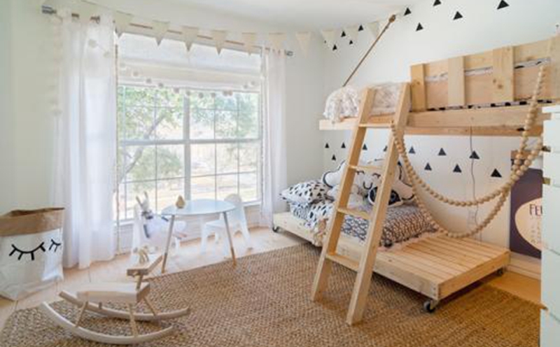 ? ? ? ? 拐角雙床:在兒童房墻角處做雙床也是不錯的設計,中間可以用儲物柜鏈接。這樣設計使房間空間開闊許多,控制區域可以作為孩子的娛樂區。